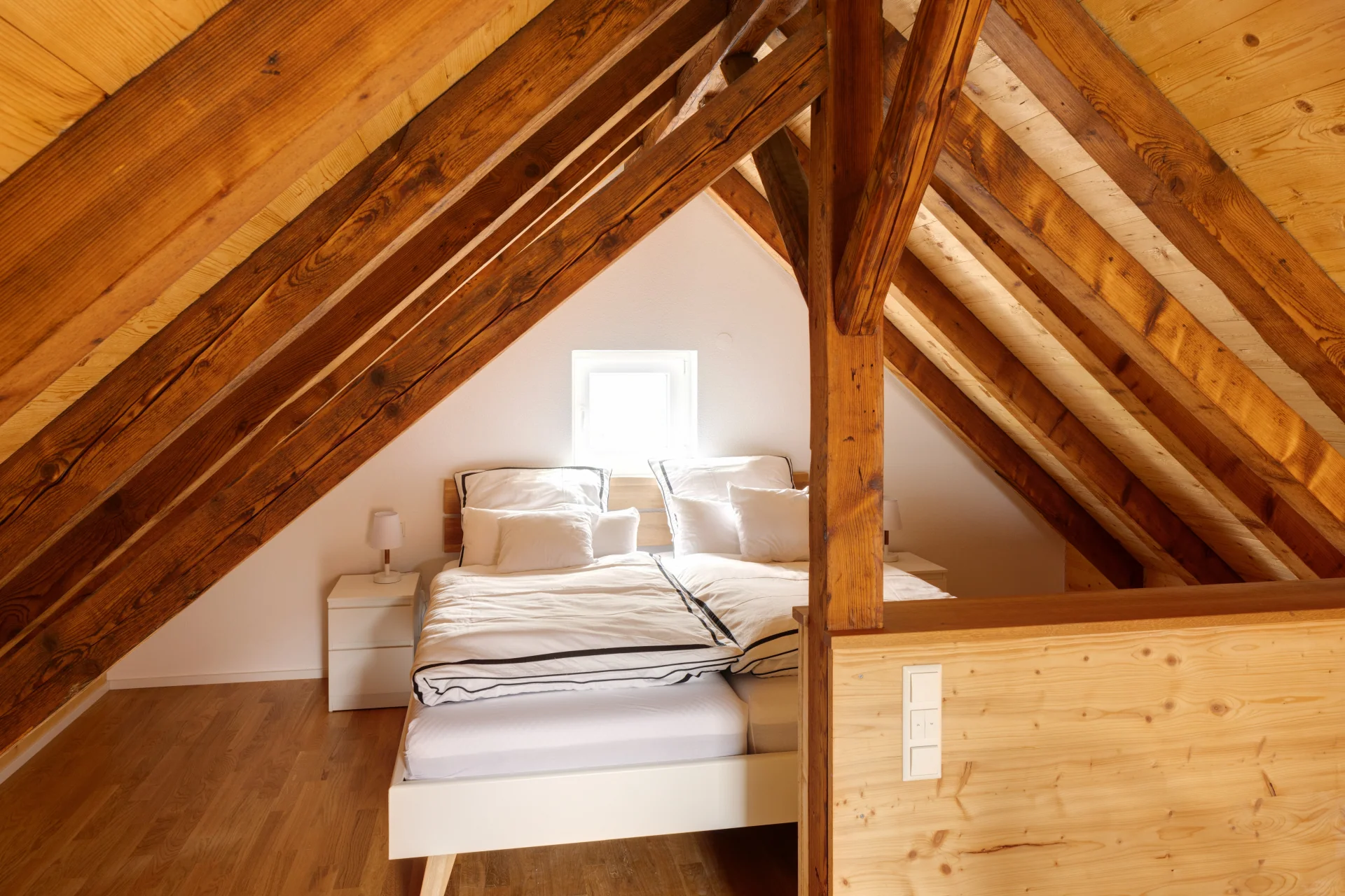 Schlafzimmer mit Doppelbett im Obergeschoss (Dachschräge); Bettwäsche und Bettdecken für bis zu 4 Personen